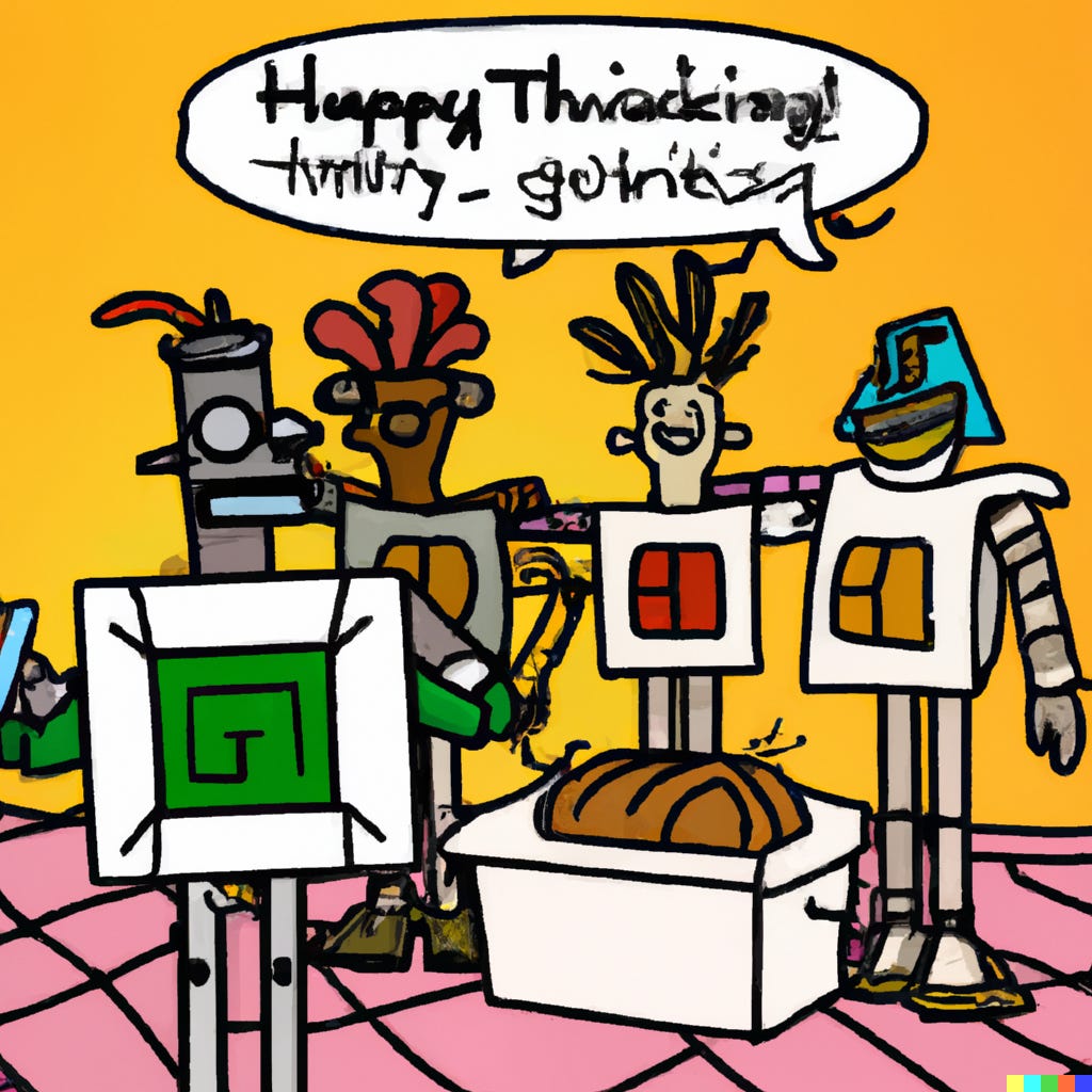 In the spirit of the holidays, I decided to try a Thanksgiving related prompt. Judging from the results, it seems if A.I. celebrated Thanksgiving, they would dress-up as Pilgrims, Indians and Turkey while eating what appears to be bread, lol.